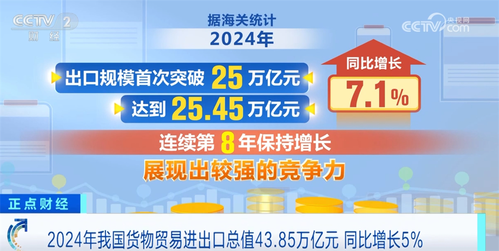 对外经贸大学中国世界商业组织研究院院长屠新泉称:“2024年我国外贸进出口成就亮眼,外贸总量、增量和质量都获得显著提拔。进出口商业额创出新高,全年实现商业顺差跨越1万亿美元。出格是这些成就是正在我国曾经具有40万亿庞大存量的根本上取得,实为难能宝贵。”正在13日上午国新办举行的旧事发布会上,海关总署副署长王令浚引见,2024年我国货色商业进出口总值43。85万亿元,总量、增量、质量“三量”齐升,规模再创汗青新高。我国货色商业进出口总值43。85万亿元,此中,同比增加7。1%,持续第8年连结增加。进口18。39万亿元,同比增加2。3%。